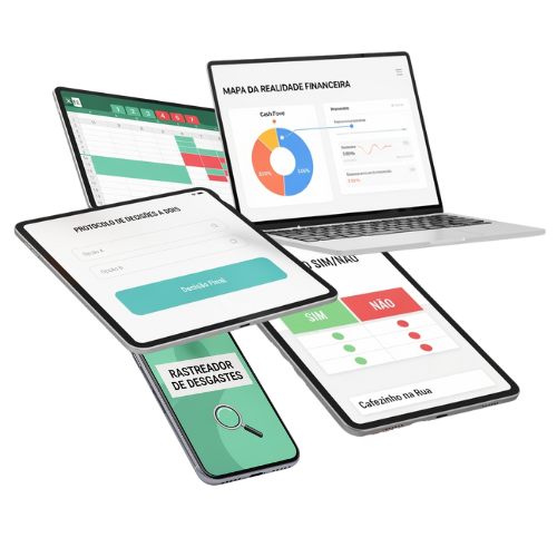 Metas, Envelopes (o futuro de vocês) e a aba final de Reunião. Você vai usar o PROTOCOLO DE DECISÕES para alinhar tudo. Fim das brigas, a clareza mata a tensão.